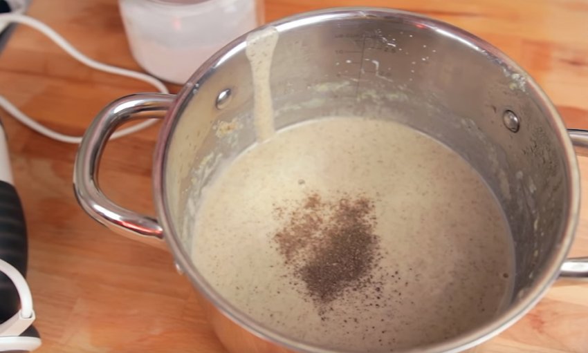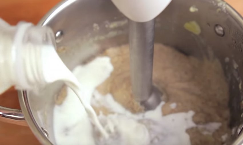 Додати молока і знову використовувати блендер. При цьому в молочну суміш слід підливати курячий бульйон до потрібної консистенції.![]()