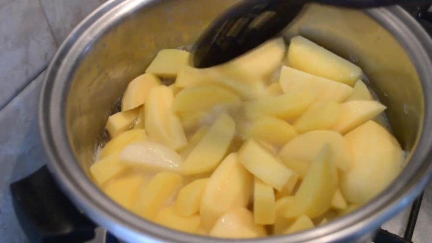 Картоплю ріжуть шматочками середніх розмірів. Варять овоч, а точніше тушкують до готовності в невеликій кількості підсоленої води (щоб у готовій страві картопля була неводянистою).![]()