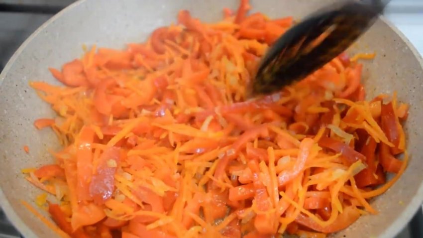 Подрібнюють цибулю (форма нарізки - за бажанням), обсмажують до прозорості. Додають моркву, натерту на тертці, а через 5 хвилин нарізаний соломкою перець. Через 3-4 хвилини кладуть до овочів порізаний кубиками помідор. Усього на обсмажування овочів відводиться 15 хвилин.![]()