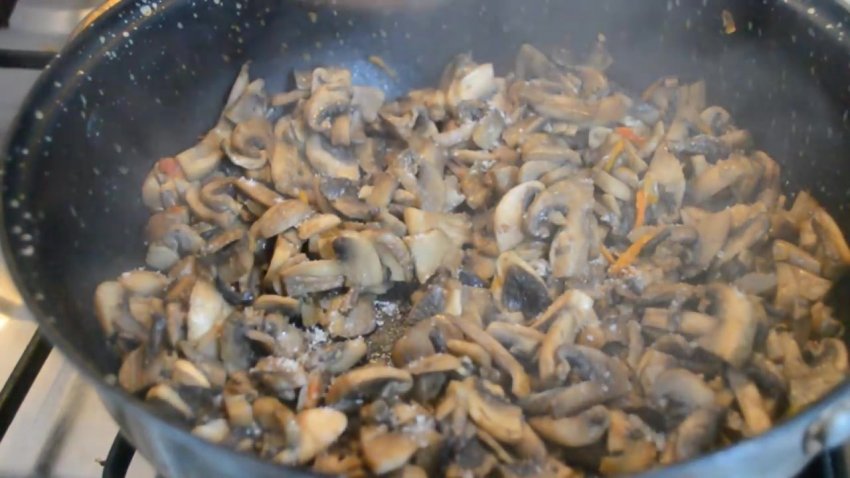 Окремо пасерують гриби до готовності. Зазвичай це 5-15 хвилин, залежно від товщини нарізки, цілі - смажать приблизно 20 хвилин.![]()