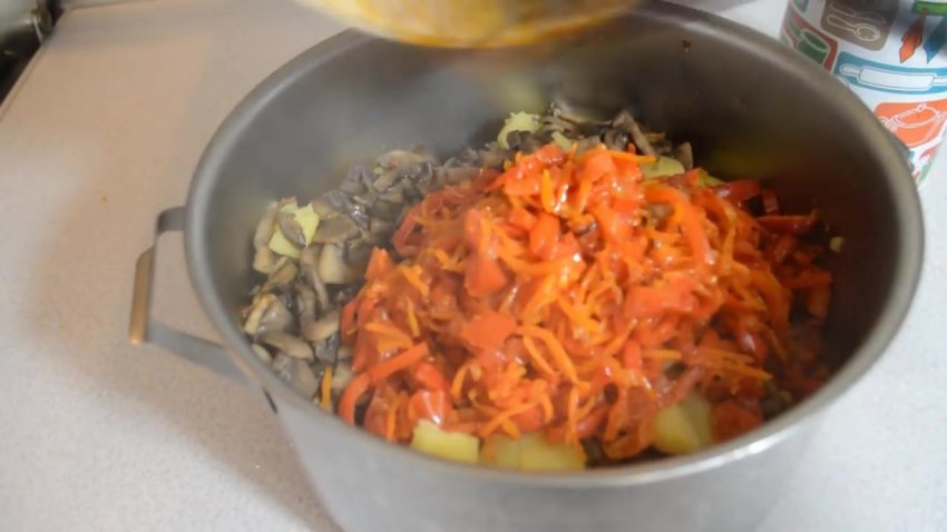Наприкінці кулінарної обробки всі овочі потрібно посолити, поперчити та додати спеції за смаком. Змішують картоплю, гриби та інші овочі. Подавати рагу гарячим.![]()