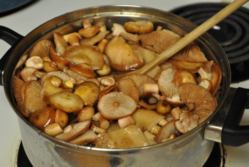 Закип'ятіть 2 літри води, залийте гриби отриманим окропом і залиште замочуватися під кришкою на півгодини, а після закінчення зазначеного часу злийте рідину, перемістіть гриби в ємність для варіння, залийте 3 літрами води, закип'ятіть і тримайте на середньому вогні ще півгодини.![]()