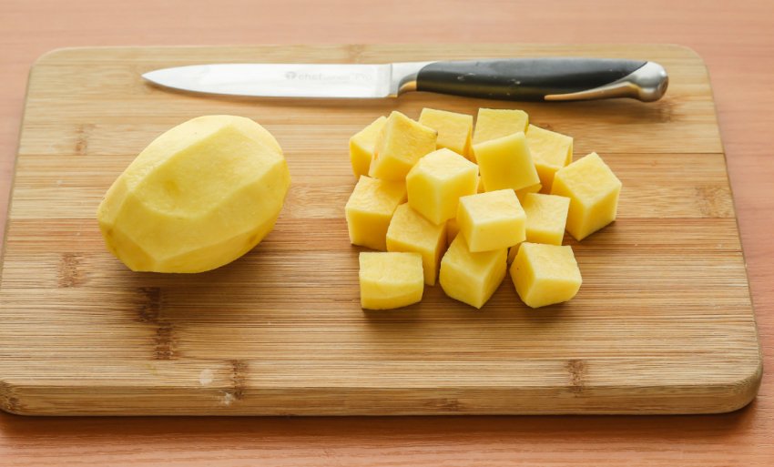 Наріжте картоплю кубиками і додайте до грибного бульйону.Варіть суміш ще 20 хвилин, поки не приготується картопля.![]()