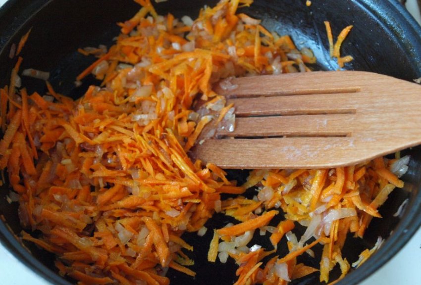 Цибулю подрібніть кубиками, морквину натріть на великій тертці.Розжарте сковорідку з рослинною олією.Обсмажте на помірному вогні цибулю до карамельного кольору.Висипте до неї моркву та продовжуйте смажити.Введіть до овочів часник, видавлюючи його через чеснокодавку.![]()