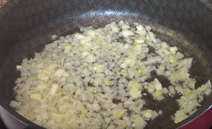 Поставити сковорідку на вогонь і налити рослинну олію. Потім ще додати шматочок вершкового масла. Коли сковорідка достатньо розігріється і масло розтопиться, помістити в неї цибулю і трохи припустити овоч до золотистого кольору.![]()