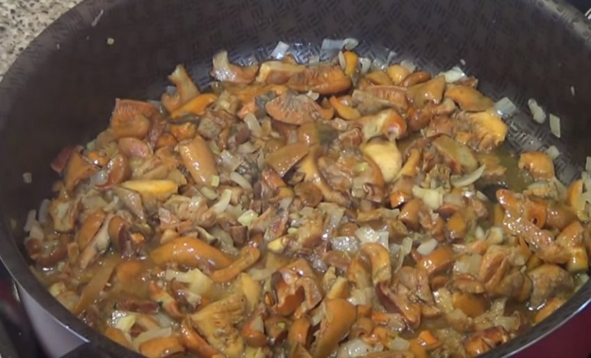 Додати нарізані рижики, сіль за смаком і смажити на середньому вогні 20 хвилин. Гриби утворюють багато вологи. Смажити потрібно доти, доки зайва рідина не випарується.![]()