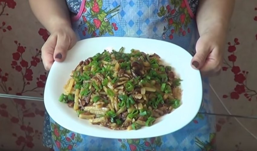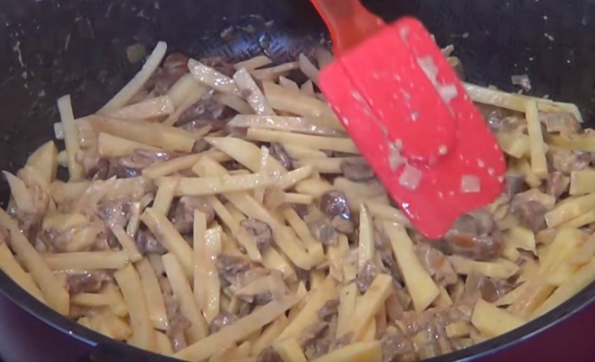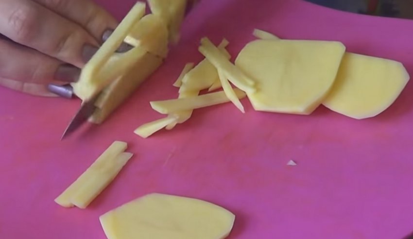 Поки гриби готуються, очистити картоплю та нарізати її тонкою соломкою.![]()