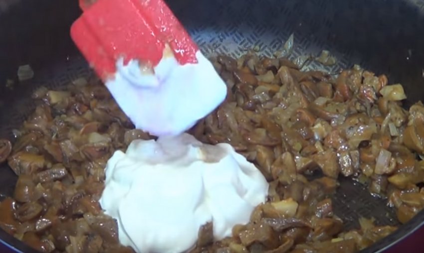 До тушкованих рижиків, коли випарується надлишкова рідина (хвилин за 15 після поміщення їх на сковорідку), підмішати сметану і тушкувати ще 5 хвилин.![]()