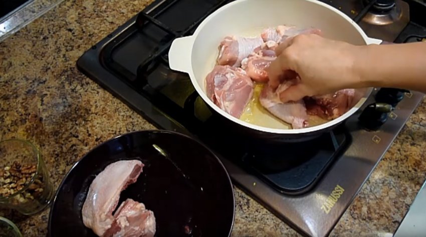 Для приготування курку слід вибирати не велику, близько 1 кг вагою. Підійдуть також стегна. Курячу тушку або частини необхідно добре вимити. Горіхи слід вибирати світлі, не засохлі. Їх необхідно очистити і вибрати ядра. Перед приготуванням обов'язково слід переконатися, що горіхові ядра не вкрилися цвіллю. Вживання запліснявілого продукту може призвести до отруєння.