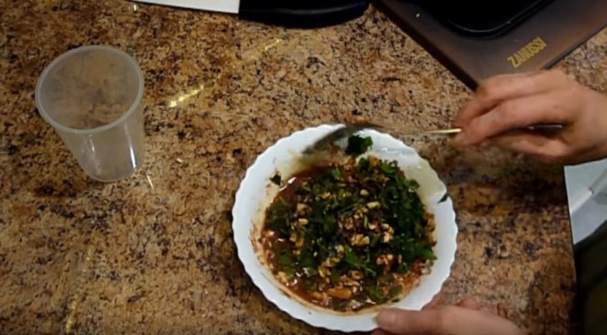 Приступити до готування пряної заправки: дрібно порубати горіхів, змішати з перцем, гвоздикою, корицею, імбиром. Залити оцтом. Перемішати, додати зелень.![]()