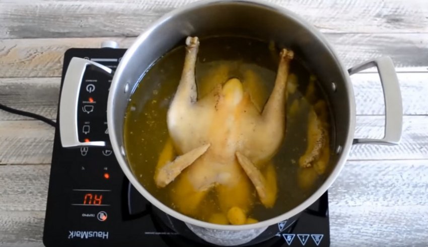 Викласти курку в глибоку ємність для варіння.Влити воду.Помістити почищені цибулю і часник, посічену кінзу.Поставити ємність на плиту.Після закипання прикрутити вогонь до мінімуму. Прибрати шум. Варити м'ясні шматки, поки вони не стануть м'якими.Готове м'ясо витягти.Процідити бульйон.![]()