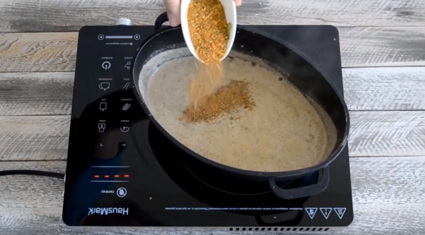 Соус готувати 10 хвилин на повільному вогні.Коли він набуде консистенції сметани, всипати сіль і спеції.Здійснити перемішування до отримання однорідної маси. Влити оцет.![]()