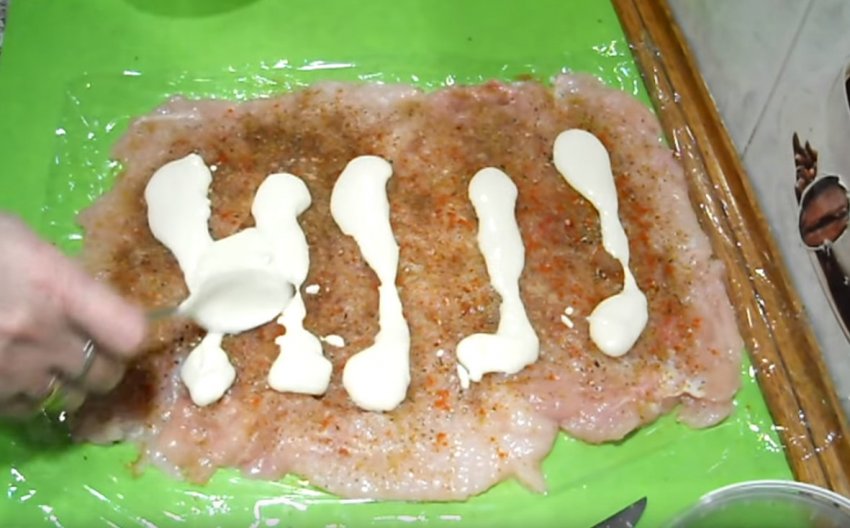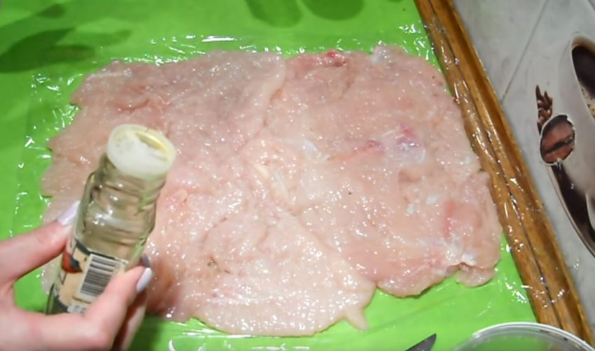 Куряче філе розділити на пласти Злегка відбити з одного боку, щоб шматки стали ширшими. Укласти м'ясні пласти на харчову плівку внахлест, формуючи одну рівну пластину. Посипати спеціями.![]()