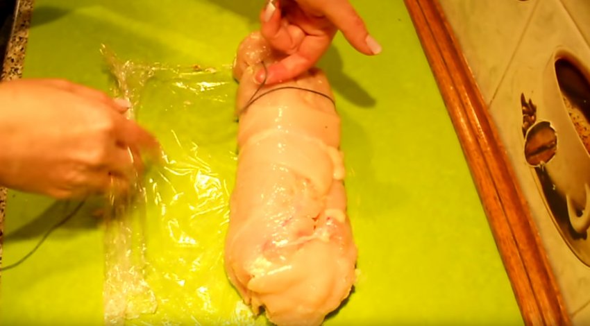 За допомогою харчової плівки туго скрутити рулет. Зв'язати його за допомогою харчової нитки. Закрити краї рулету. Укласти його на тарілку швом донизу.![]()