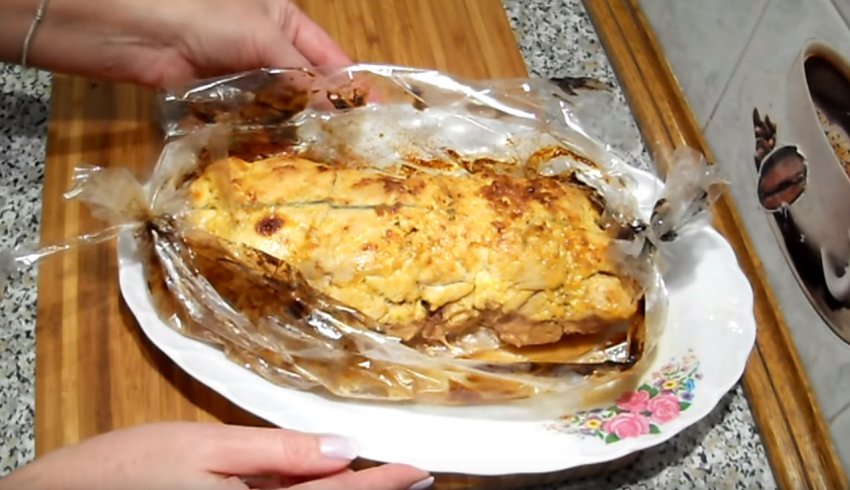 Виймати рулет із рукава слід, коли він добре охолов. За бажанням гарячу страву можна присипати тертим твердим сиром.![]()
