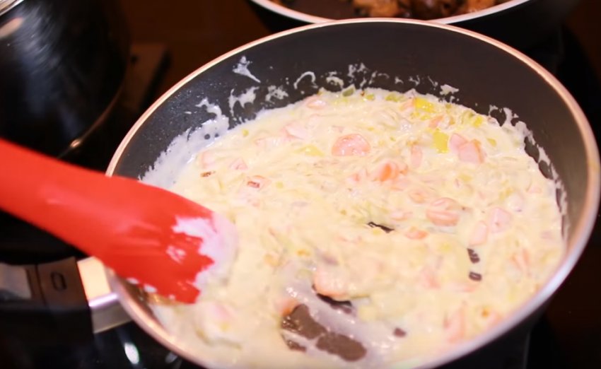 До моркви та цибулі додайте вершки. Їх потрібно плавити при високих температурах, інакше продукт візьметься грудками при вливанні в суп.![]()