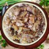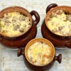 - Скласти в каструлю або горщики м'ясо та гриби з цибулею. Долити воду і поставити в духовку на 30 хвилин.