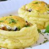 - Помістити в кожну форму по 1 ст. ложці картоплі. Злегка притиснути з боків. Запікати картопляні гнізда до темно-золотистого кольору близько 25 хвилин. Вийняти гнізда з форм на деко, вистелене паперовими рушниками.