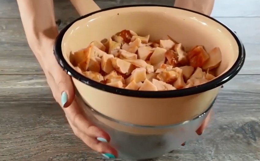 - Відварити продукт протягом 20 хв. Рідину злити, промити під проточною водою і дочекатися повного охолодження грибів.