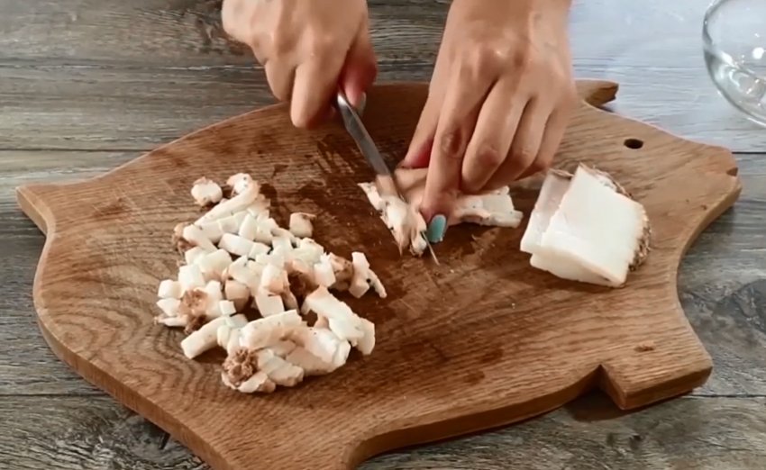 Сало подрібнити кубиками, а цибулю - півкільцями.![]()