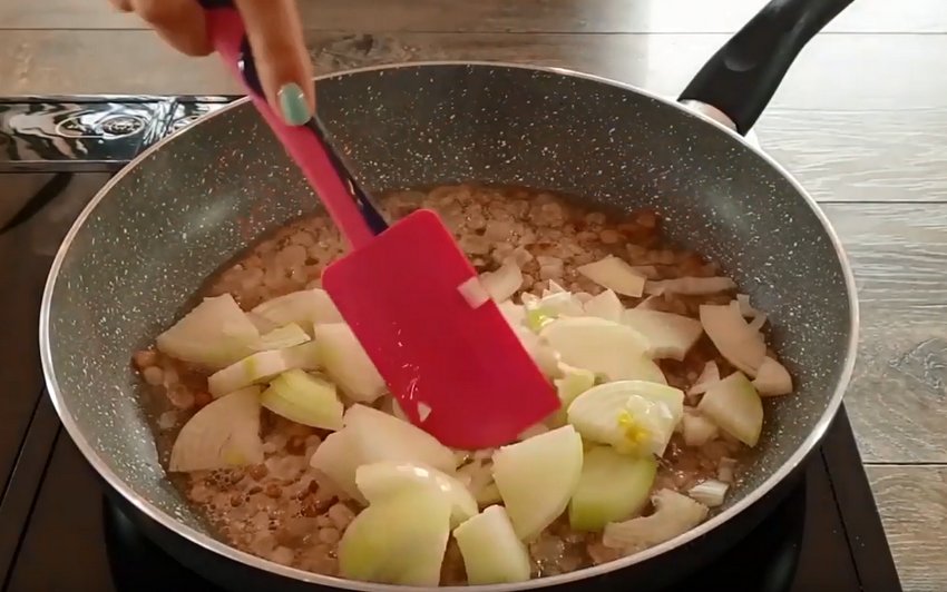 Обсмажити сало до золотистого кольору, потім додати цибулю і продовжити маніпуляцію до його розм'якшення.![]()