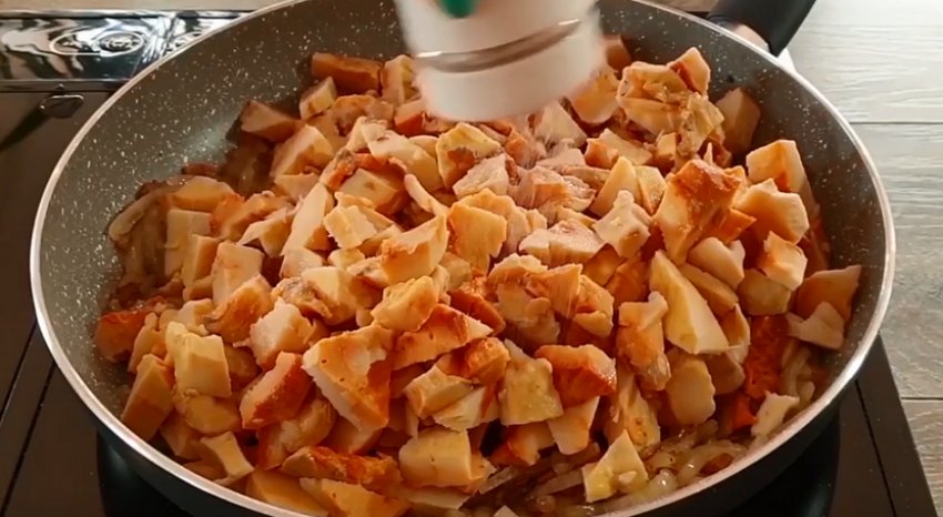 Помістити до засмажки гриби, посолити, поперчити. Продовжувати обсмажування ще близько 20 хв.![]()
