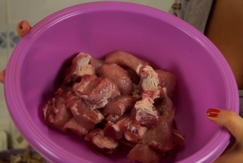 - Наріжте м'ясо пластами, добре відбийте кухонним молотком і поріжте невеликими шматочками