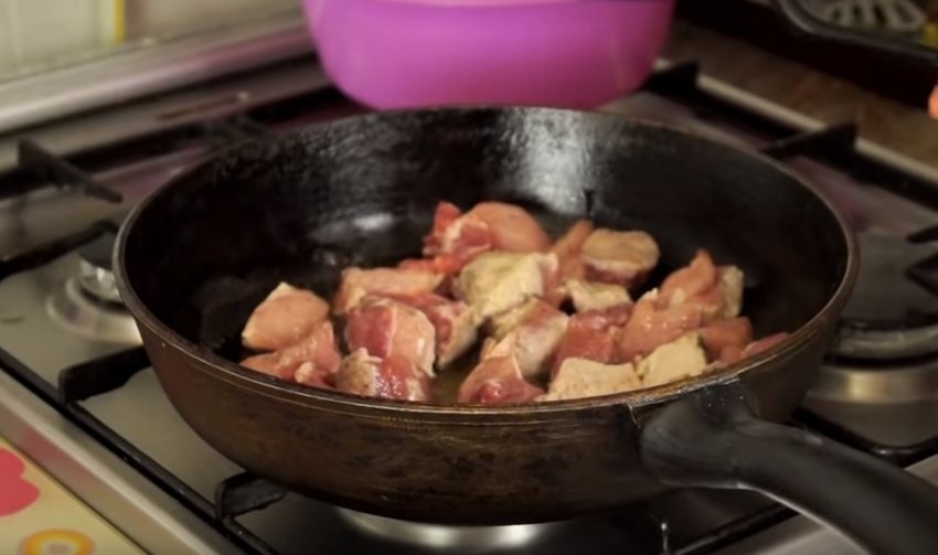 - Вилийте на пательню трохи рослинної олії та обсмажте м'ясо з усіх боків до появи рум'яної скоринки (зазвичай на це потрібно близько 20 хвилин).