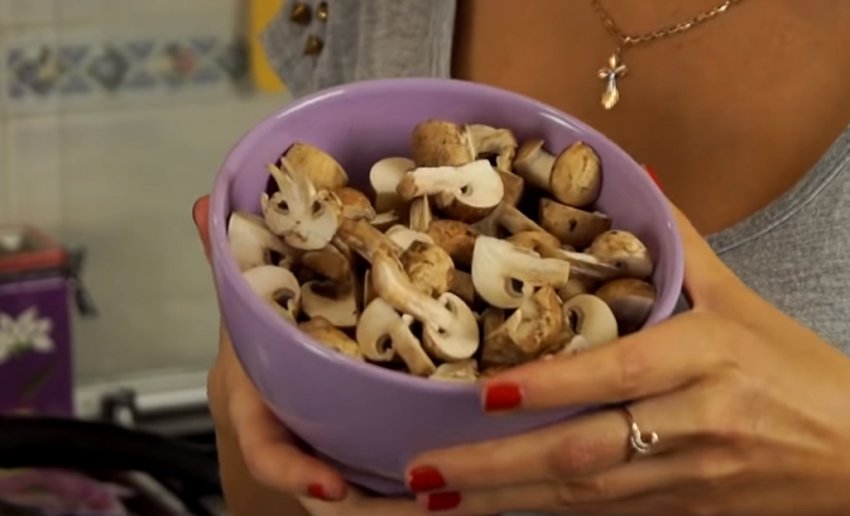 - Очистіть печериці і наріжте їх у довільному порядку (якщо невеликі - можна розділити кожен грибок на 4 частини).