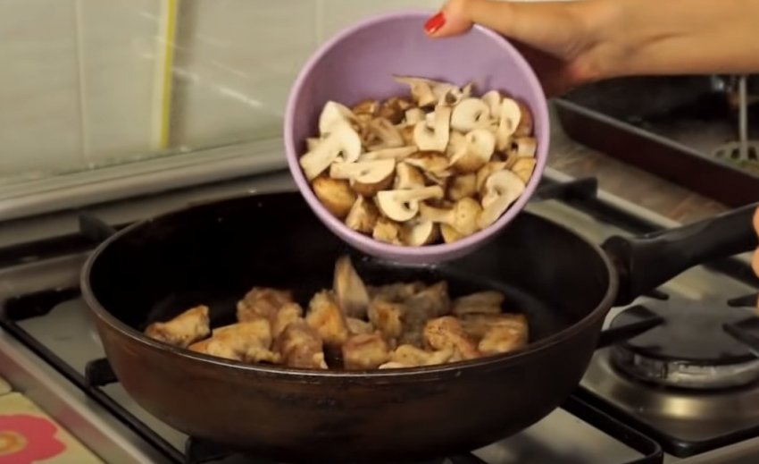 Почистіть гриби, розріжте великі екземпляри на 4 частини і висипте в сковороду до м'яса, що вже підрум'янилося.![]()