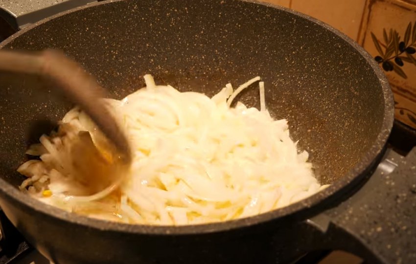 Цибулю нарізати півкільцями і висипати в киплячу олію.![]()
