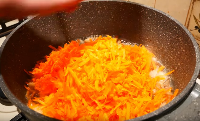 Нарізати 400 грамів грибів квадратиками і додати до цибулі. Гриби обсмажувати до напівготовності та постійно помішувати. Моркву нарізати великою соломкою і висипати в казанок.![]()