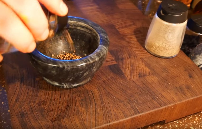 Посолити, поперчити і перемішати. Приготувати спеції. У ступку висипати чорний перець, коріандр, паприку і зіру. Розтовкти і додати в казанок з овочами.![]()