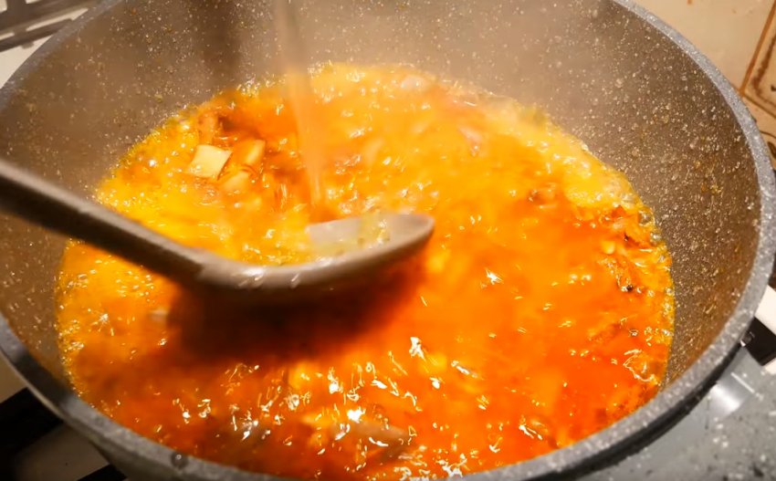 У готову основу для плову додати гарячої води. Вода має покривати засмажку шаром 1 см.![]()