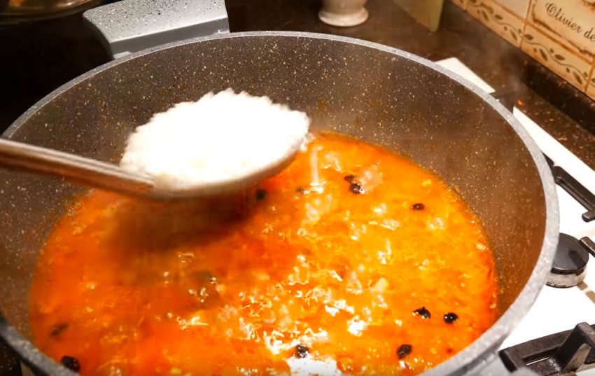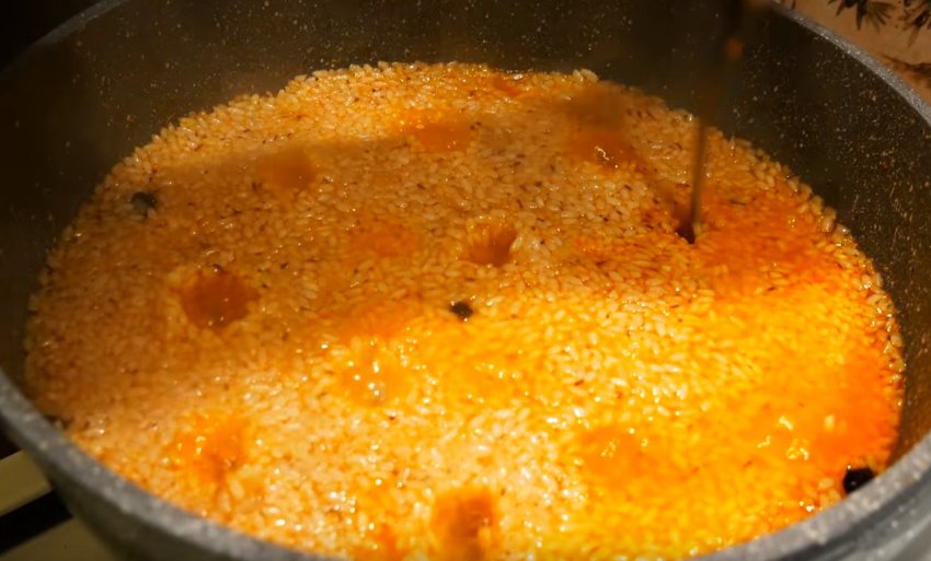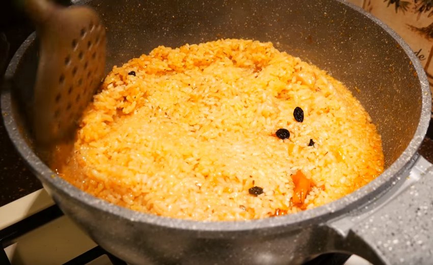 Зменшити вогонь, прикрити кришкою і залишити тушкуватися протягом півгодини. Викласти в казанок рис, не перемішуючи. Розподілити рівним шаром.![]()