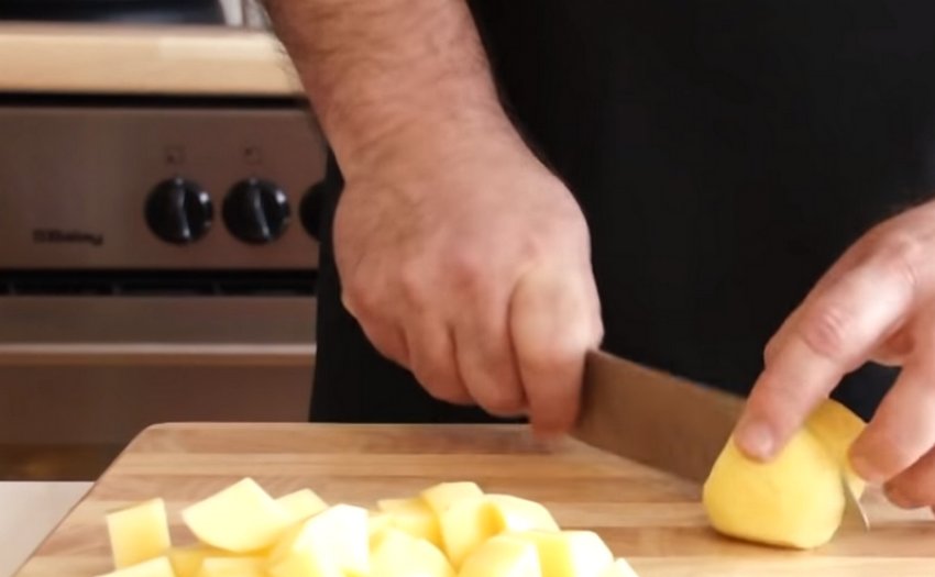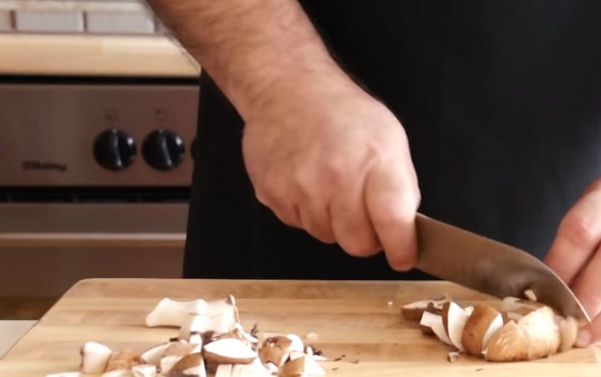 Печериці протерти вологою ганчірочкою і подрібнити кубиками завтовшки 1 см.![]()
