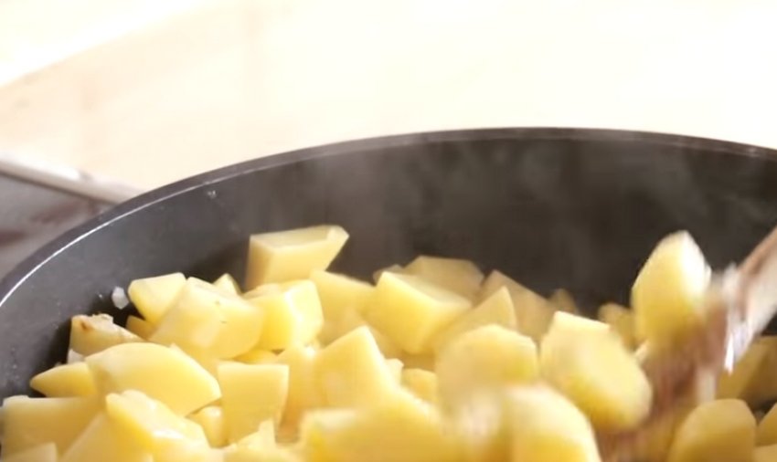 Додати нарізану картоплю і прогріти, періодично перемішуючи дерев'яною лопаткою.![]()