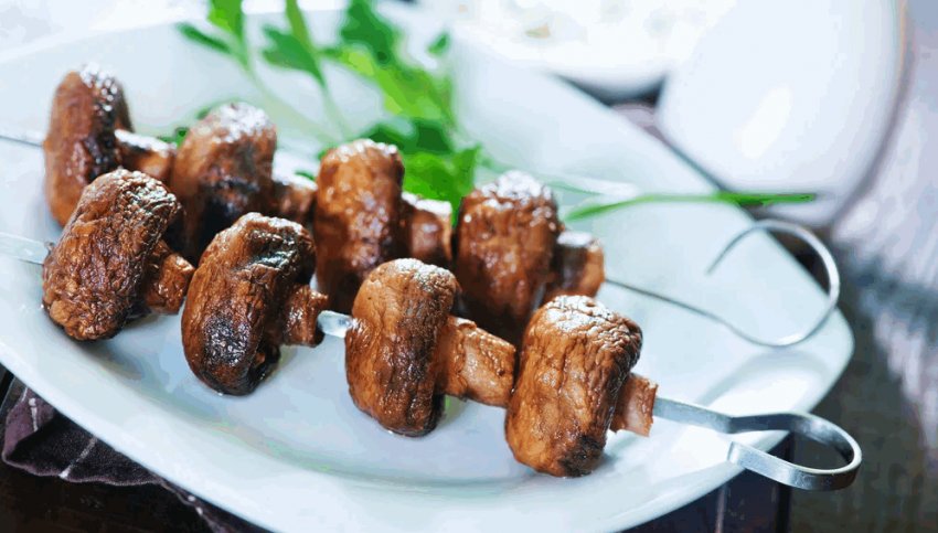 - Зав'яжіть пакетик і добре перемішайте печериці, перекидаючи їх з боку в бік. Залиште гриби настоюватися протягом 30 хвилин, а потім насадіть на підготовлений шампур (з відстанню між сусідніми екземплярами 1-1,5 см) і відправте смажитися на мангал із вугіллям (відкритого, занадто спекотного вогню не повинно бути).
