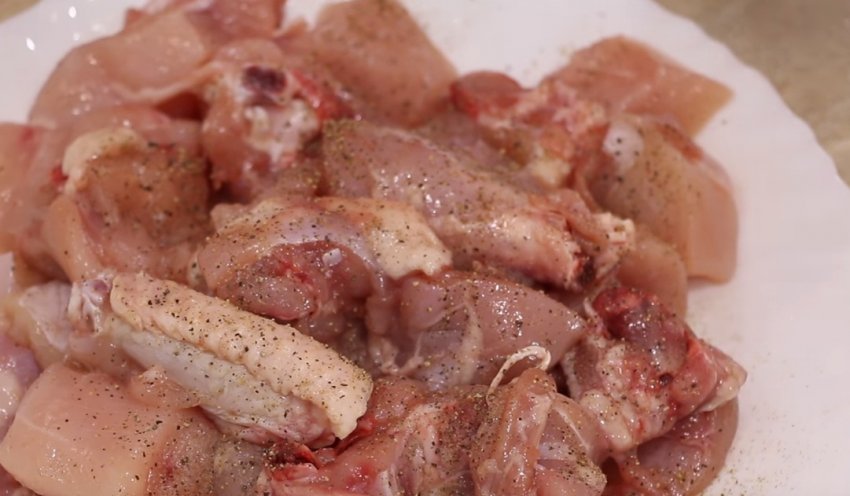 Замочіть гриби, щоб вони встигли розм'якнути, помийте курку й акуратно зніміть з неї шкіру. З крила можна не знімати. Кістки прибрати.Наріжте м'ясо невеликими шматочками. Посоліть і поперчіть його, додайте спеції. Перемішайте і залиште маринуватися.![]()
