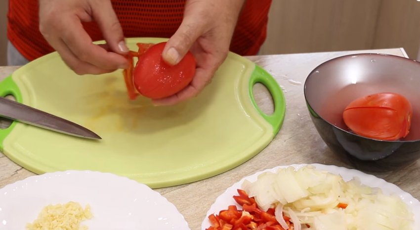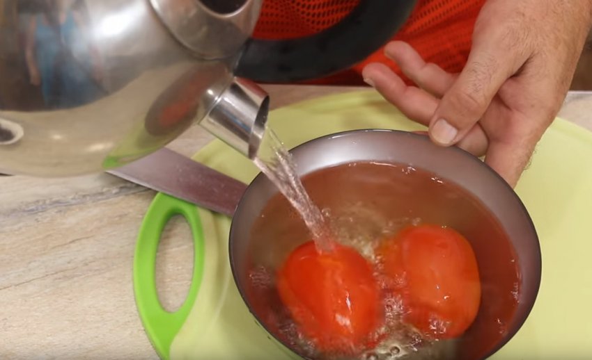 З помідорів зніміть шкірку. Для цього надріжте її так, ніби збираєтеся розрізати томат на 4 частини. Покладіть у миску, залийте окропом і залиште на 5 хв.![]()