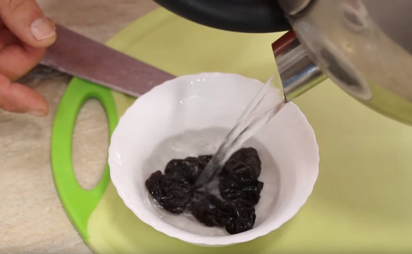 Злийте воду з чорносливу і помідор. Чорнослив розріжте навпіл. Очистіть томат від шкірки та наріжте кубиками. Картоплю також.![]()