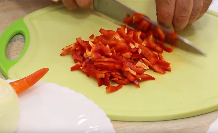 Наріжте моркву кружальцями, перець солодкий і цибулю соломкою, часник дрібно нарубайте.![]()