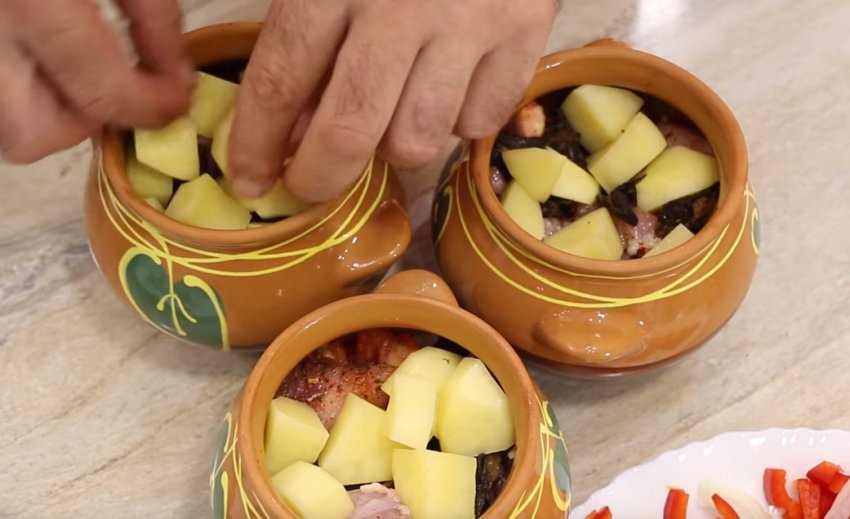Покладіть у горщики часник, цибулю, картоплю.![]()