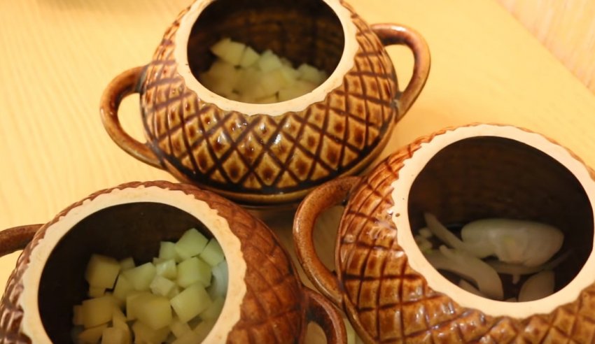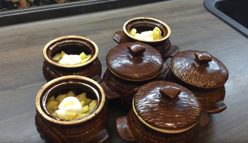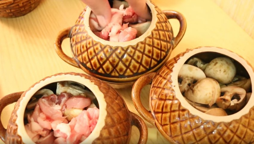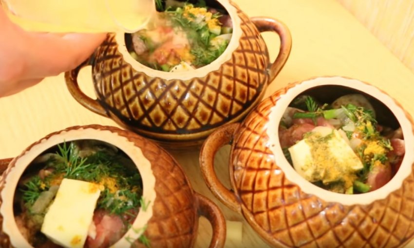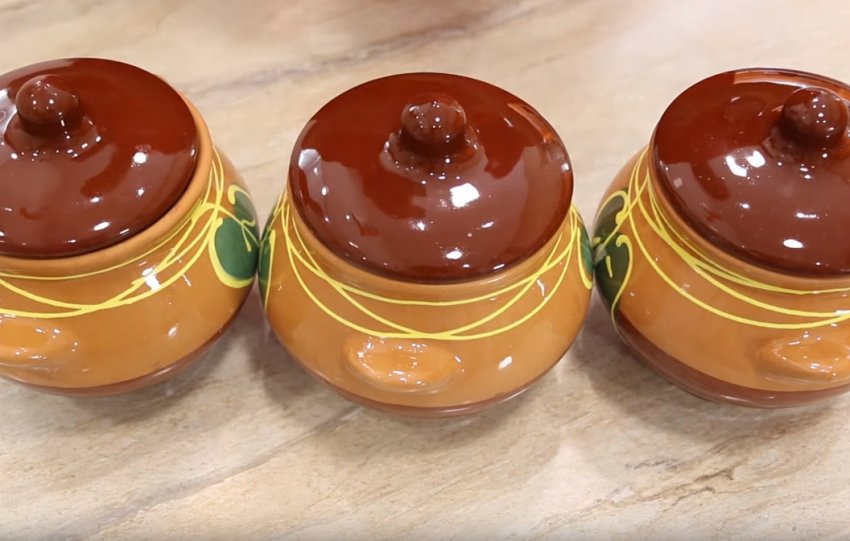 Влийте по ½ горщика води. Зверху покладіть ложку майонезу або сметани, закрийте посуд кришками і відправте їх у духову шафу, прогріту до +200°С. Через 100-120 хвилин печеня буде готова.![]()