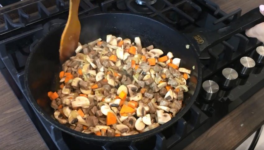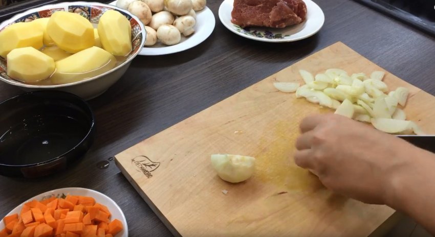Наріжте дрібними скибочками моркву, цибулю тонкими півкільцями, яловичину невеликими шматочками. Для зручності м'ясо можна різати трохи підмороженим. Подрібніть середніми скибочками картоплю, поріжте зручним способом гриби.![]()