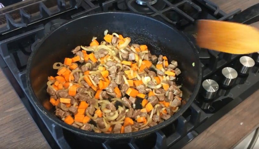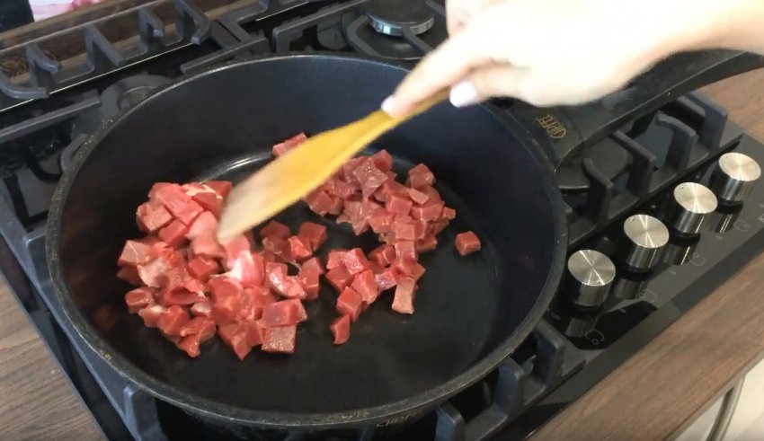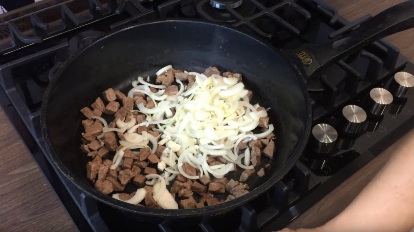 На суху сковорідку, що стоїть на середньому вогні, викладіть яловичину і рівномірно розподіліть. Обсмажте 10 хв. до випаровування всієї вологи.![]()