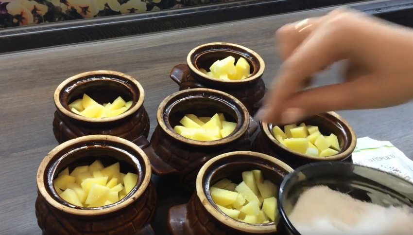Розкладіть засмажку по горщиках. Зверху покладіть картоплю, щоб заповнити посуд. Посоліть, додайте прянощі.![]()