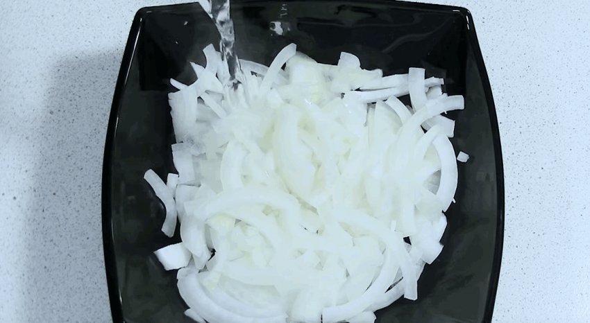 Відварити всі інгредієнти, що підлягають термічній обробці, в різних ємностях. Очистити яйця, цибулю, картоплю в мундирах, моркву. Ріпчасту цибулю нарізати соломкою і залити на 10 хв. окропом.![]()