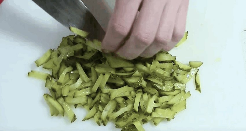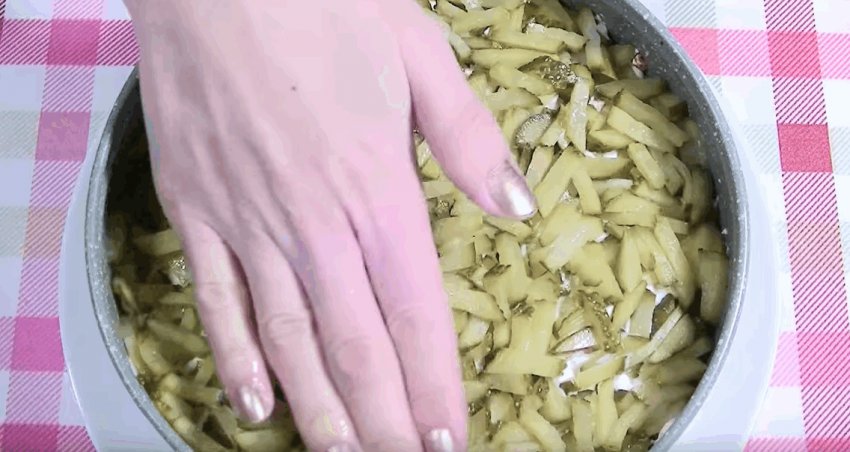 З нарізаних соломкою маринованих огірків зводиться 5-й "поверх" страви.![]()
