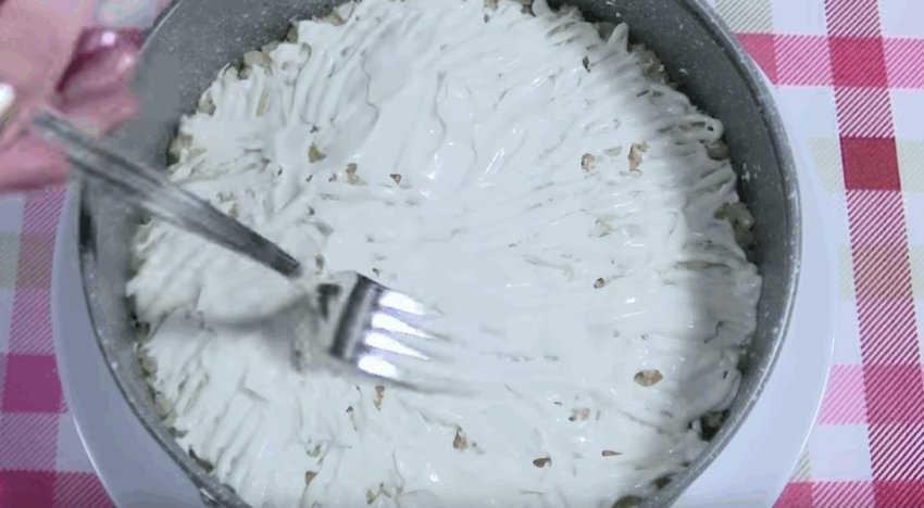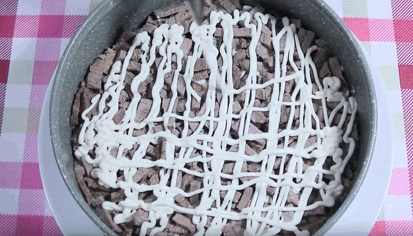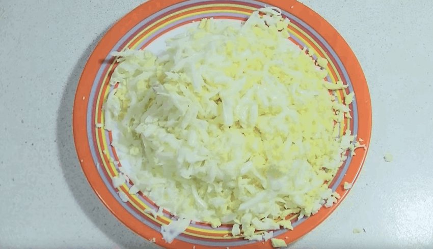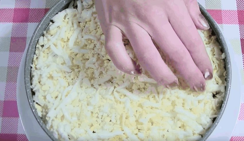 На майонезний прошарок поверх нього насипаються подрібнені яйця.![]()
